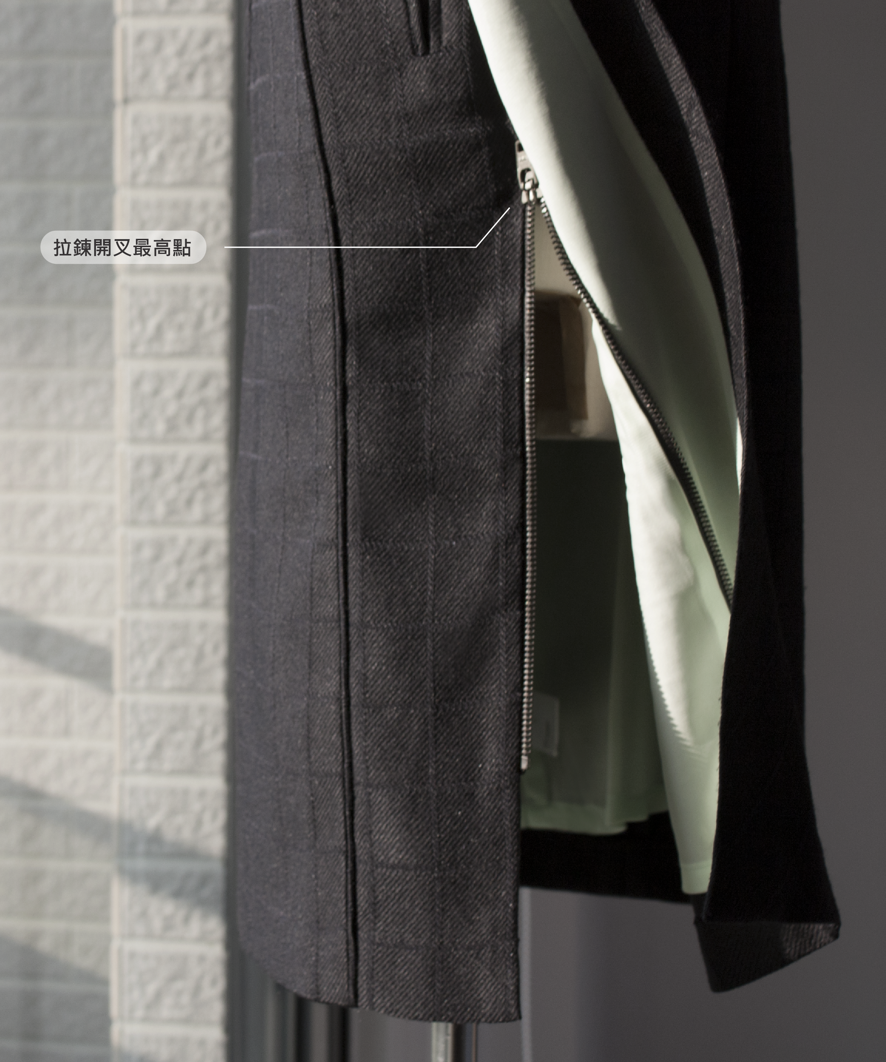 可調整拉鍊開叉設計,靈活調整高度,隨心塑造完美比例
